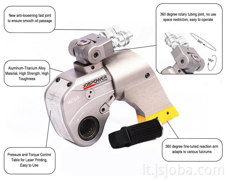 La chiave idraulica a cavità sottile è realizzata in materiale in lega di alluminio-titanio ad alta resistenza e il processo di stampaggio di elaborazione monopezzo è leggero e durevole. Utilizzato con il manicotto di transizione idraulico cavo e la pompa speciale per la chiave idraulica automatica, può chiudere automaticamente e allentare il collegamento a bullone.