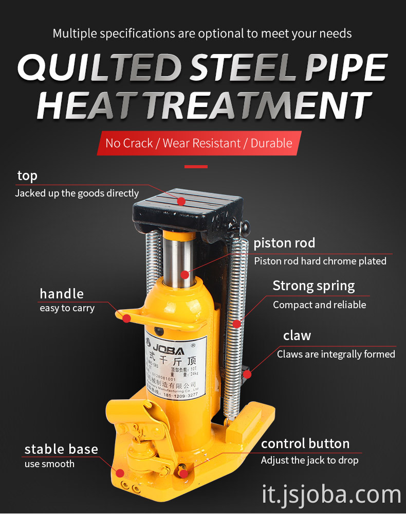 Claw Jack è una sorta di prodotto meccanico ampiamente utilizzato nella produzione automobilistica, macchinari di fonderia, trasporto, ecc. Per il sollevamento delle attrezzature e il supporto delle attrezzature. La parte di artigli del jack artigli è formata integralmente, che è robusta e resistente, e la maniglia mobile del jack idraulico è facile da trasportare. La parete interna e l'albero principale del cilindro idraulico del jack artigliano sono resistenti all'usura e resistenti alla corrosione e l'alto sigillo aumenta la sua durata di servizio. Jack Jack Active Spring per retrazione automatica e rapida. Il jet jet toe jack è alto, di buona qualità, sicuro e conveniente da usare.
